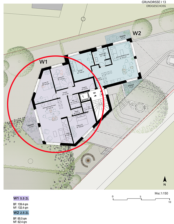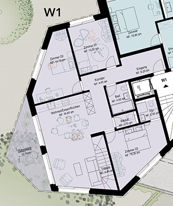 Die Balkone und Gartensitzplätze bieten Ausblick und Freiraum. Der umgebende Allgemeinbereich wird als Teil des Gemeinschaftseigentums gepflegt. Die Wohnungen in den Obergeschossen bieten Wintergärten die eine wetterunabhängige und ganzjährige Nutzung ermöglichen. Die Attikawohnung wird von einer grosszügigen Dachterrasse umschlossen. Vor allem der gedeckte Sitzbereich dient hier in der warmen Jahreszeit als Erweiterung des Wohnraums.